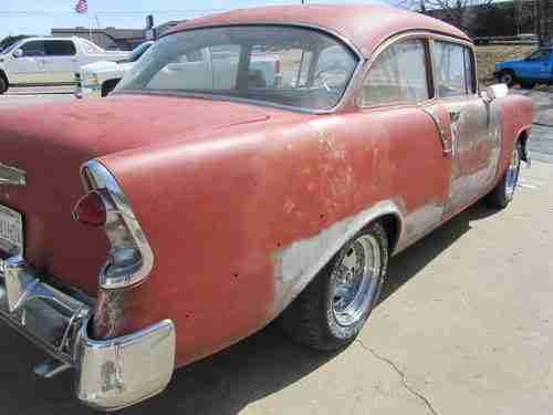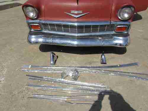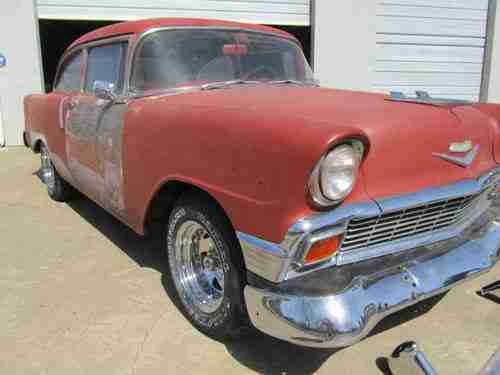 1956 CHEVY 210 what a garage find,this 2 door post runs & drive's, has a rebuild 283 cid engine 4 bbl. carb with dual exhaust.sound's good,has a powerglide trans.that shift's good,has new bumper's with guards.chrome custom wheel's,all the stainless most of the side stainless is new.with new clip's.new black carpet with new insulation.new door seal moulding's.This little car need's some TLC a paint job and new interior to go thur the roof..see our other item's www.ok-classics.com