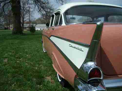 You are looking at a beautifully restored 1957 Chevy 210 4 door. This car is a multi show winner and a head turner. This cream puff has been restored from the frame up. 47,499 miles...believed to be original miles. Still has original spiral shocks. The Blue Flame six cylinder engine and original power glide automatic transmission were pulled, gone through with new gaskets, seals, etc. and reinstalled after the firewall and motor were repainted. This is a high quality paint job including door jams, etc...it looks like a sheet of glass. It was painted the original color scheme of Canyon Corral and Ivory and has new weather stripping and matching fender skirts. The car was all disassembled and taken to bare metal for the paint job and restoration about six years ago. The frame and undercarriage have been painted and undercoated. This is a very solid car...floor pans, body mounts, etc (see pics). The doors open and close very nice. This car drives and rides like a dream.