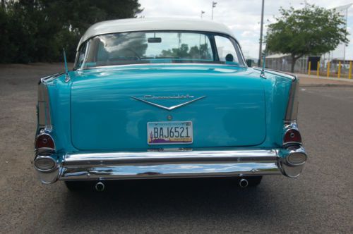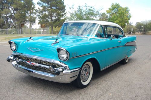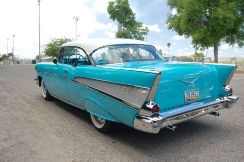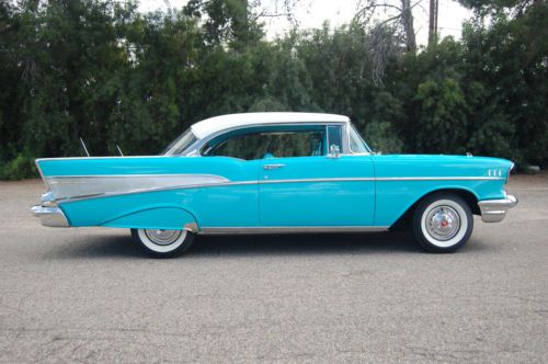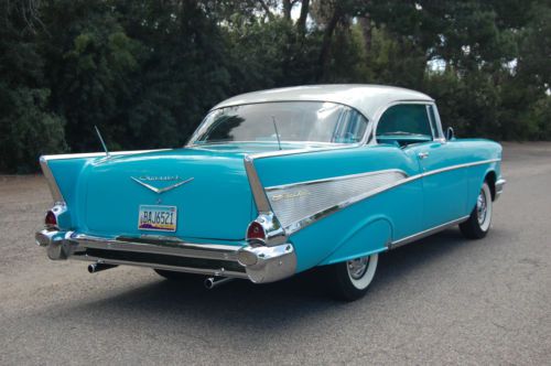 FOR SALE IS A 1957 CHEVY 2 DR H.T. THE CAR HAS JUST HAD A BODY ON RESTORATION WITH 2 STAGE BASE COAT CLEAR COAT REFINISH AND LOOKS VERY NICE. THE ENGINE HAS BEEN REPLACED BY A PRIOR OWNER WITH A 350 C.I. CRATE ENGINE BUT THE ORIGINAL 283 C.I. 2 BBL ENGINE IS INCLUDED WITH THE SALE. I CANNOT SPEAK FOR THE CONDITION OF THE ORG. ENGINE. THE INTERIOR HAS BEEN REDONE BY A PRIOR OWNER AND IS IN VERY NICE CONDITION . ALL GAGES AND SWITCHS WORK WITH THE EXCEPTION OF THE CLOCK. I THINK THAT THOSE WORKED FOR ABOUT A YEAR WHEN NEW. THE TRUNK AND ENGINE COMPARTMENT'S ARE CLEAN AND IN GOOD CONDITION FOR THE AGE. THE RADIO AND HORNS ARE AFTERMARKET AND HAD BEEN REPLACED BY A PRIOR OWNER,HOWEVER THE ORGINAL RADIO AND HORNS COME WITH THE CAR. I DO NOT KNOW IF THOSE ITEMS WORK OR NOT. A SMALL SECTION OF THE DRIVERS FLOOR HAS BEEN REPLACE BY A PRIOR OWNER. THE REST OF THE FLOOR-ROCKERS-TRUNK AREA LOOK GOOD. THE CAR DRIVES VERY NICE AND GETS A LOT OF LOOKS AND THUMBS UP WHEN I HAVE DRIVEN IT. IF A BUYER WOULD LIKE TO HAVE SOMEONE INSPECT THE VEHICLE, I HAVE NO OBJECTIONS TO THAT. A $1,000.00 DEPOSIT WOULD BE REQUIRED WITHIN 48 HOURS AFTER THE END OF THE AUCTION FROM THE HIGH BIDDER. THERE IS NO WARRANTY IMPLIED OR EXPRESSED ON THIS VEHICLE. THE CAR IS SOLD AS IS WHERE IS. I RESERVE THE RIGHT TO END THIS AUCTION AT ANY TIME AS THE VEHICLE IS FOR SALE LOCALLY. !!!!!!!!!!!!!!! THE RESERVE HAS BEEN LOWERED !!!!!!!!!!!!! SHIPPING WILL BE PAID BY THE BUYER. IF YOU HAVE ANY QUESTIONS, PLEASE E-MAIL ME AT STEVESBAD55@YAHOO.COM AND I WILL GET BACK TO YOU AS SOON AS POSSABLE. THANKS FOR LOOKING