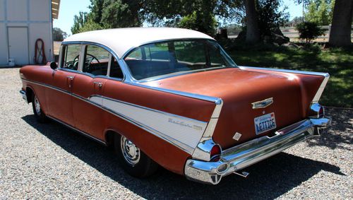 ALL ORIGINAL 1957 4 DOOR BEL AIR. WE ARE SECOND OWNER IN 2011. ORIGINAL OWNER WAS GREAT AUNT, AGE 96, DROVE IT FROM 1957-1977. THEN IT WAS STORED IN OUR BARN FROM 1977 - 2011. HAS 36,695 MILES. RUNS GREAT!