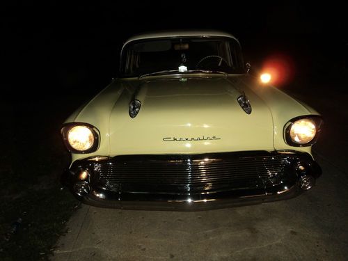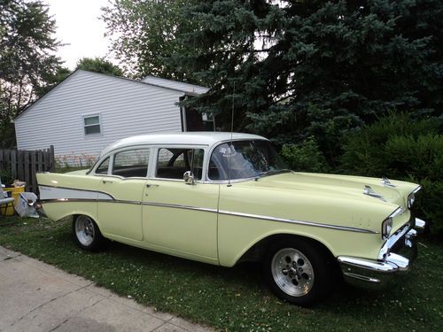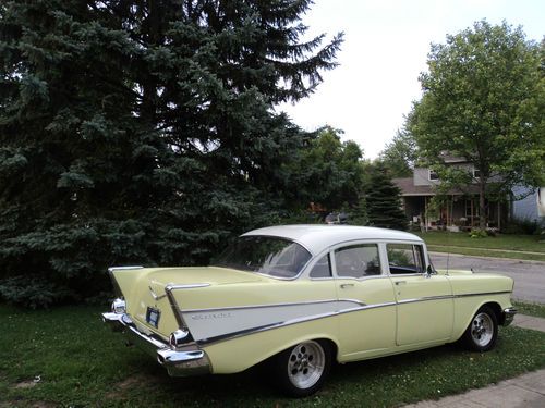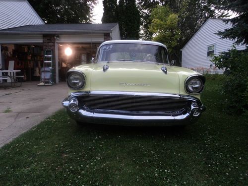 Award winning "Best of the 50's" LKQ auto show ( 6-8-2013), 57 Chevy 210 Belair 4 door, Automatic, 235 6 cyl..all original, 107,500 miles, auto tranny, the motor is outstanding. I use this as a daily driver and show it from time to time as original 57 Chevy class. The outer paint is two tone, Yellow with White top. Paint is older but nice. Floor new, with new carpet, new gas tank, new exhaust, new wheel cyl, new brakes pads, Lights and brakes lights rewired, new shocks on back...good driver. Has all complete new chrome front and back installed 4/11/2013. ... All other chrome good but not perfect. The 210 Stainless trim is ok but not perfect. Piece missing on back vent window the only trim missing, besides backup housing lights, but have new glass for it. Has new Michelin tires and American Racing outlaw wheels 7" on front, 8 " on back. shown in pic. Trunk is rock solid. Interior is shot and needs completely restored ..all intact, and all there, but not the best condition..too wore out for me, headliner, seats and door panels has stains, scratches...this is not a perfect car, The tranny will slip on you if you ride it hard from stand still, but no trouble if you drive it right. but still a good driver with some show quality. there are no major rust issues, except drivers side back door, small hole on floor. This Chevy is about 75% done...I've tried to describe this to best of my ability..feel free to ask questions or you can call me at given number. Kenny 317-657-7879
