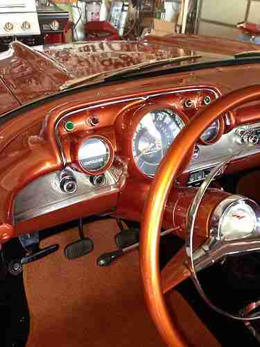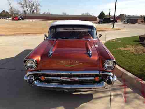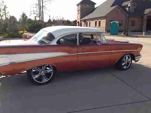 1957 Chevrolet Bel-Air 2 door hardtop. Copper paint with white roof. Copper & white Vinyl upholstery with diamond pleats. Chrome Foose Wheels P245/45R18 in front & P245/45R20 in back. wheels in the back. 327 cu. inch engine. 3-speed transmission on the floor. Power steering. Power disc brakes in the front. Garage kept. Non-smoker. Multiple Show Winner. Needs nothing. Get in and drive anywhere.