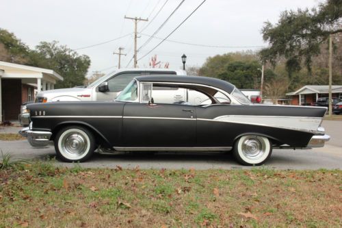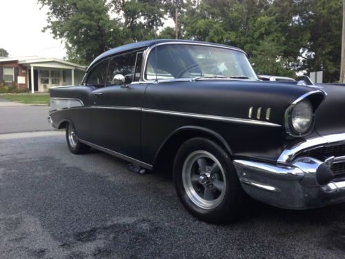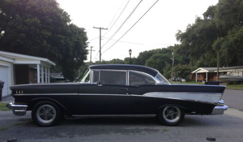1957 Chevy 210 2 Door Hardtop Converted to Bel Air -SMALL BLOCK 350 -TURBO 400 TRANSMISSION -LOCKAR SHIFTER -NEW GLASS -POWER BRAKES -FRONT DISCK BRAKES / REAR DRUMS -NEW FRONT BILLSTAIN SHOCKS -NEW REAR MONROE COILOVERS -NEW INTERIOR -NEW HEADLINER -VINTAGE DIGITAL RADIO -NEW GAGES -ALL LIGHTS WORK -NEW COOKER WHITE WALLS -NEW WHEELS -CAR IS SATIN BLACK WITH RED AND WHITE PINSTRIPE ALL CHROME AND STAINLESS STEEL IS MOUNTED ON THE CAR. -CAR COMES WITH REAR DISC BREAK CONVERSION KIT AND MID SIZE HEADERS. -IF YOU HAVE ANY QUESTIONS PLEASE FEEL FREE TO ASK. -KEEP IN MIND THAT THIS IS A 57 YEAR OLD CAR BUT SHE IS IN GREAT SHAPE FOR HER AGE. -CAR ONLY COMES WITH ONE SET OF WHEEL AND TIRES IF YOU WANT BOTH SETS OF WHEELS AND TIRES WE CAN WORK SOMETHING OUT. -MOTIVATED TO SELL- |