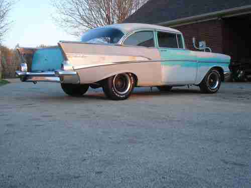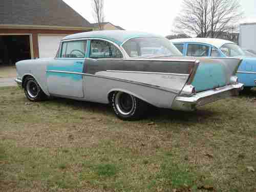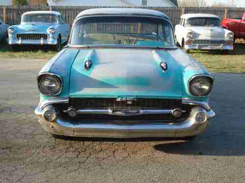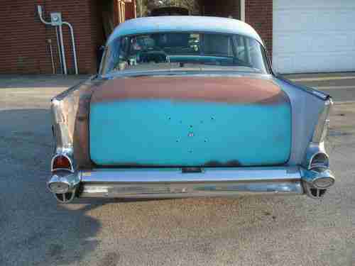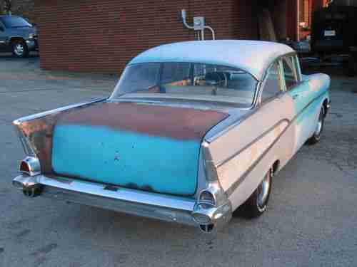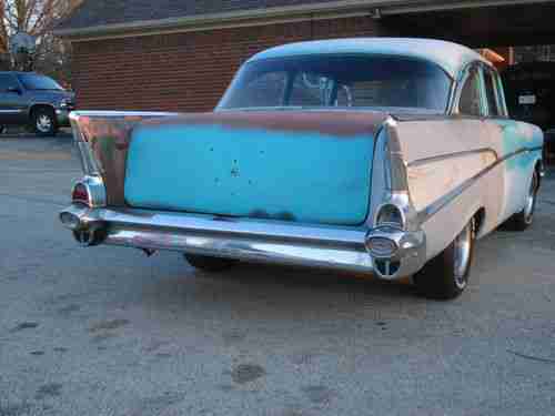 1957 CHEVROLET Bel Air. 2 DOOR SEDAN. PROJECT..NEEDS TOTAL RESTORATION.350 ENGINE , I'VE NEVER HEARD RUN . IT DOES TURN OVER. NO TRANSMISSION. STRAIGHT BODY. SOME RUST IN FLOORS AND TRUNK, BUT EASILY REPAIRABLE BY AN EXPERT. ORIGINAL SEATS THAT HAVE BEEN RECOVERED SOME YEARS AGO , GOOD CONDITION , REAR SEAT HAS A FEW PUNCTURES IN THE FABRIC. ANYTHING YOU SEE MISSING... IS MISSING.!. UNDERSIDE LOOKS LIKE A 55 YEAR OLD CAR.OLD AND RUSTIC. FRAME IS RUSTY COULD BE REPAIRED. SHOULD BE REPLACED.GLASS IS GOOD. DOORS OPEN AND SHUT GOOD.GREAT HOT ROD PROJECT.