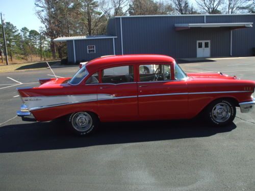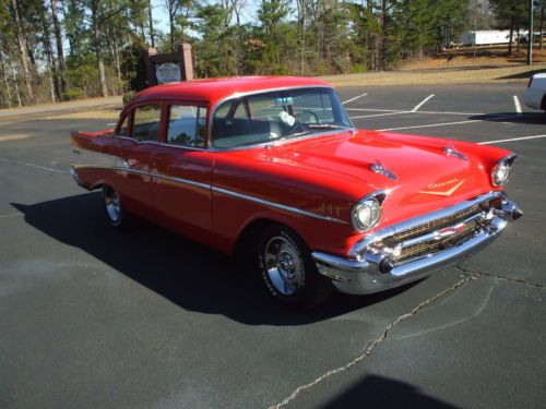 1957 Chevrolet bel air 210 fully restored, brand new 350 4 bolt main gm crate engine, 300+ horse power. turbo 350 profeshionally built. engine and trans have less than 700 miles on them. engine has polished aluminum intake, edelbrock 1406 four barrel carb, hedman full length headers,and dual exhaust, vitage style polished aluminum valve covers and breather. crane cams fireball electronic ignition system. very strong. stock rear end checked and serviced and in excellent cond. body stripped to bare metal before paint no rust or repair found then primed blocked base coat clear coat and cut and buffed to a brilliant shine. all weather stripping/rubber bumpers/window channels/fuzzies replaced all windows roll smooth and doors shut like new. complete interior new from headliner to carpet. all chrome has been newly rechromed, all stainless removed and polished, 4 brand new white letter tires with corvette rally wheels. am/fm vintage radio with mp3 from vintage audio. comes with matching fender skirts in the trunk. this is an awesome car for show,cruise or touring. call or text any questions 601 677-2005