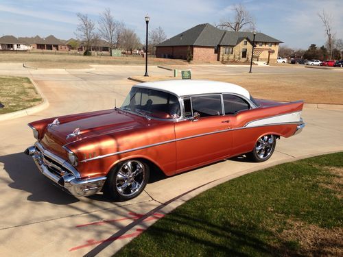 1957 Chevy Bel-Air two door hardtop. Power Steering. Disc Brakes on the front. New Copper paint w/ a Cream top. New Copper and Cream Interior. 327 Cu. in. V8. 3-speed Transmission. 20 inch Foose wheels in back. 18 in. Foose wheels in front. Ready to drive anywhere. Everything works. Garage-kept. Non-Smoker. Needs Nothing.
