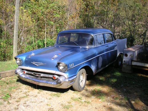 1957 Chevrolet Bel Air 4 door sedan, seats available but currently out of vehicle and door handles and emblems taken off but available and placed in trunk of car. Rebuilt 307 engine with less than 100 miles on engine, new powerglide transmission, new steering column, needs tires, paint, and interior completely redone. One small rust spot on passenger side rocker panel that will be shown in picture, remainder of body redone and primed, hoodbar needs replacing, new floor pans in front need to be welded in. Older restoration when I acquired it, but have done extensive work to vehicle and had it completely gone through by certified mechanic. Due to health issues I am no longer capable of working on vehicle to complete it. Selling so I can acquire a restored collector car to drive to Friday night cruise ins and drive around town on good weather days. Vehicle starts and runs good. Payment to be made in Cash or Cashiers Check only. Buyer is responsible for pick-up and shipping. Someone will be available to assist with loading vehicle. |