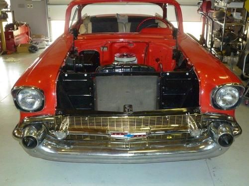 1957 Chevy hardtop, good start that ran out of energy, engine compartment and underside of car is finished, paint is savable having small garage wear nicks, hood needs repaint, no rust, good rockers, good floors, good body mounts, trunk floor has had some repair work, right rear quarter panel has been replaced. The engine is a slightly used but very good condition 350, with a 340 hp Corvette manifold, four barrel dual line Holley carburetor, aluminum pan, non-vented Corvette valve covers,with a 350 Turbo transmission, that has all been mounted front, middle, & rear with Camaro cross member. The car has new side window glass in the box, new exhaust system, 605 power steering box, front disc brakes, many new Danchuk & Eckler parts such as mirrors, handles, emblems, gold grille & "V" for hood, license plate frames, plastic lenses, rubber goods, hood bullets, battery tray, linkage, windshield wipers, keys & locks, chrome trim fasteners, other misc. Most parts to complete the restoration are there in boxes, not much is missing and many parts have duplicates. Front suspension has all been rebuilt, seats are bolted in just to show they are there, but need upholstery. Original floor in the car has never been cut for a floor shift. If you need any further info or additional pictures, or would like to view the car in person on a lift, call (602) 790-3532. Buyer needs to send $1000 within 48 hours of end of auction. Car will not be released until funds have been paid and cleared.