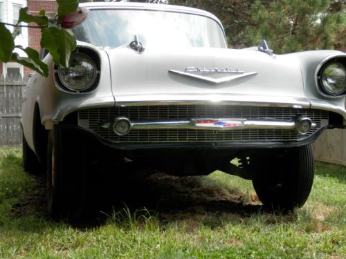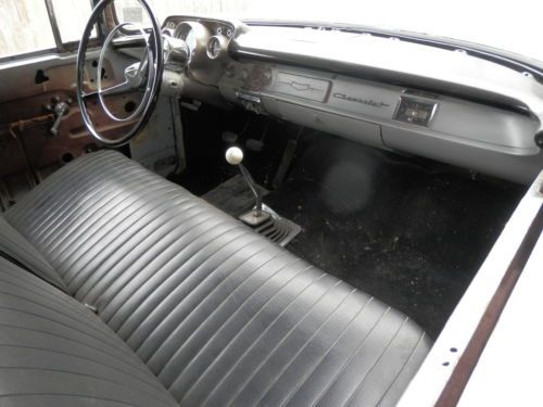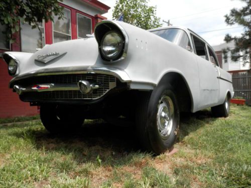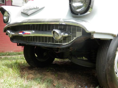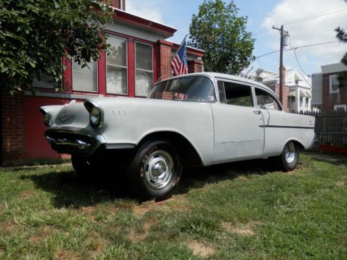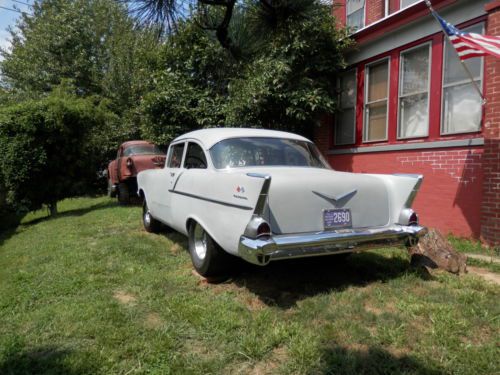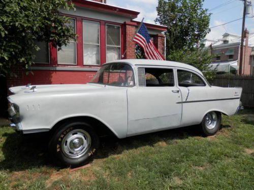 ok here we have a 57 150 model 2dr in primer with a small block 4 spd and 4.56 posi rear car starts. runs. drives. and stops does every thing it should hate to part with this one but taxes have to be payed this is one solid 57, floors and trunk in great shape. body as well, except for drivers door someone patched lower half with skin from another car in my opinion needs door skin one small rust spot in roof along drip edge about size of a pencil eraser1/4 inch hole. more about motor it is an early small block pre 1970 4 bolt main with 12.5 to1 pistons, block decked 10 thousands, 202 doublehump heads shaved 20 thousands, old solid lifter 30/30 cam, 750 holly, alum intake and Mallory dist double row chain, roller rockers motor fires right up runs very strong. on pump gas it pings, Sunoco 112 octane makes it real happy very low miles I know im missing something but back to that later now the trans yes its a 4 spd no its not a Muncie its a saginaw . a m22 rockcrusher is available,( at additional cost) the rear is the stock housing with a nos gm 4.56.1 center section with posi., rear sat on shelf for 40 yrs before I purchased it in 2002. door glass and drivers 1/4 glass I have them but they are shot. windshield and back glass are great, now the body it has nos front fenders and hood mind you this at least 10 yrs ago that's how long ived owned it like I said about doorskin otherwise very clean wheels are gm repro with 4 inch rallys up front and eights out back L- 60 15 m/t on back and m/t et drag on front never raced all stickers are repro I put them on for show car also has new11inch flywheel and new hayes 3 finger pressure plate and new clutch new air shocks car comes with new rear springs and kit to move them inboard of frame new gas tank new sender new staps and new fuel line it has big block springs in front sits high ljke a gasser also have new weatherstripping for the car not installed and I do have the front bumper anything else call me at 267 784 2297 thank you, bill