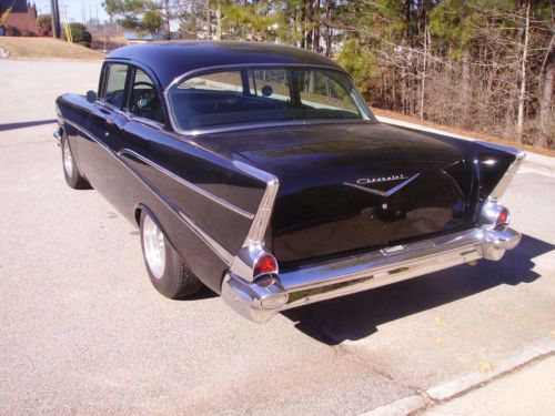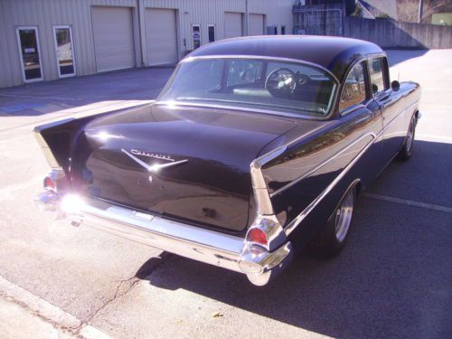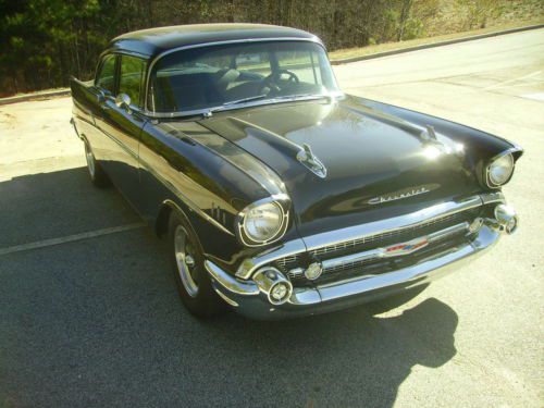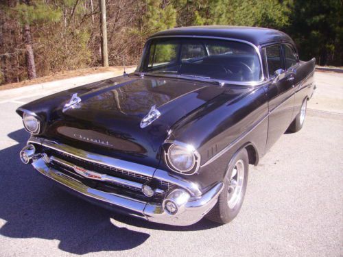 BLACK BEAUTY. Here is a really nice 1957 Chevy 210 with a built late 70's 350 engine that sounds and runs great connected to a 400 Turbo transmission. This car has a super straight body with Black paint that has a deep shine to it. It has American Racing wheels with new tires. All the chrome is in excellent condition. The interior is a beautiful Gray and Black Del Ray style interior. It has the original frontend that has been completely redone with new bushing etc.. and it has the original rear 57 housing. It features power steering and power disc brakes on the front along with Vintage heat and air. No rust anywhere on the body that I have seen. The underside of the car is also very nice with no rust issues. It has great sounding Dual Exhaust. The engine has alot of chrome and is nicely detailed. The trunk is clean and solid. This car drives out great. I reserve the right to end auction early if car sells locally. It is being sold AS IS with no warranty given or implied in anyway. Pre sale inspections are encouraged so you will know exactly what your getting. The pics on this beauty speak for there self. I have many more also you are welcome to look at, just let me know. This 57 is sold with a current Georgia registration in the current owners name as Georgia WILL NOT issue a title on a vehicle this old. You will be able to get a title in your state with the paperwork I give you so don't worry about that. Thanks for looking |