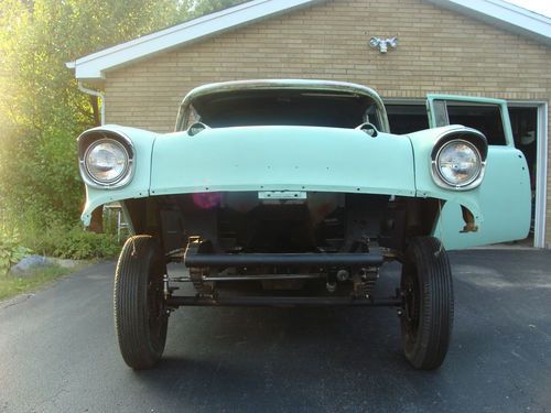 1957 chevy 2 dr altered wheelbase gasser project.No motor or trans. This is a solid texas car.The rear suspension has been moved foward 9".The front straight axle has been moved foward 4".It has an early 60's big pontiac rearend w/5.13 gears.Also has 5ft ladder bars.Needs brakes and drums and leaf springs.The front suspension is an all new nickey chevy kit(3895+labor) that has been done professionally.Only thing missing are the calipers. The front floorpans have been tacked in but need finishing. The firewall is also new and set for a big block chevy.Have the rear bumper(good shape) most of the trim...taillights etc. No windshield or front seat.The rest of glass is still in it. Very solid car...only hole is in the tailgate on the inside...a few pin holes on outside of gate.I have a set of BBC fenderwell headers that go with car. Was set up for BBC/4spd. Needs all brakes and lines and wiring. Would not take much to get on the road or the track. No time or space is the only reason for sale. Please ask questions,will try to answer best I can.The car is sold "As Is,no warranty". $500 deposit due within 3 days of the end of the auction.