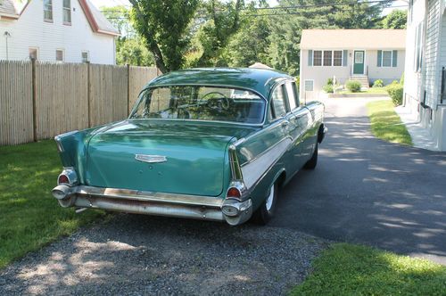 1957 Chevy 4 door 6 cylinder 3 speed standard shift. Green with new paint job and new exhaust, also all weather stripping around door and trunk. Need chrome work.