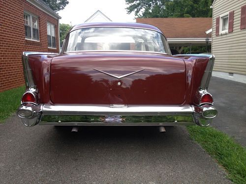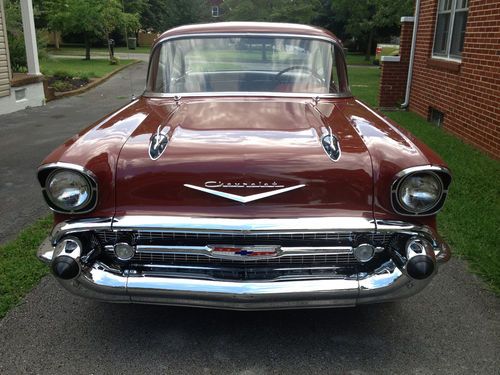 1957 Chevy 2 Door Sedan. True Bel-Air car. Just restored. Beautiful new wine color paint. 350 engine with 350 turbo. New front disc brakes, rear brakes/wheel cylinders, brake lines, gas tank & fuel lines. All rust cut out & repaired correctly. New floors including toeboards all the way back. Also new complete trunk floor. Have all receipts for all sheetmetal. Car has all new chrome including bumpers, hood bar/extensions, hood rockets, grill, grill bar, etc. New glass. New tires on 8" chrome Vette rally's. All new interior over original seats. Car has been completely rewired. Clear Tennessee title. If you have any questions just ask. $1000 deposit within 48 hours of auction close. Remainder due within 7 days. I reserve the right to end the auction early.