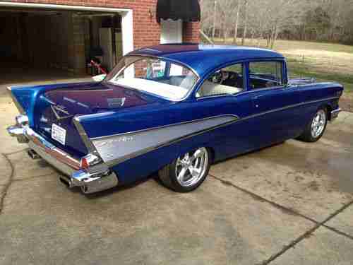 This is a two-door 1957 Chevrolet Bel Air the car has a small block 350 with gear drive, Edelbrock carb, and aluminum intake. The car has lots of chrome on the engine, power steering, power disc brakes, air conditioning, 4 speed transmission, Foose wheels, custom gauges and interior, 550 miles since restoration. All chrome and stainless trim in good shape.