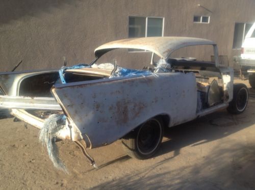 1957 Chevy Bel Air HT No 75% complete If your ready to start a project here it is good start for a decent price.I am not posting this as a ready to paint project obviously or slap a engine in it and go if your familiar with restoring cars then you would understand what potential this has.No engine needs floors,Fire wall solid Quarters could use some attention,have front fenders hood trunk doors are alittle rough on bottom but overall straight could either use a new skin or repair,Got most of chrome trim at least the hard to find stuff,front an rear bumpers has front seat no windshield or rear glass Dash is in very good condition no damage,I took it all part an here she sits.I would love to see this back on the road and not parted out or cut up to make another car but to each its own,There's only so many left I know I will regret selling this down the line.But i cant let it be yard art forever.Bill of sale I will not ship out of country.Thanks for checking it out and please do ask all if any questions you might have.If you would also like more pictures please let me know.