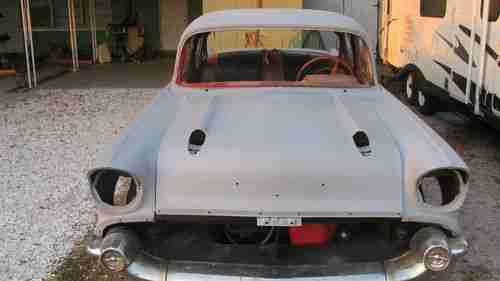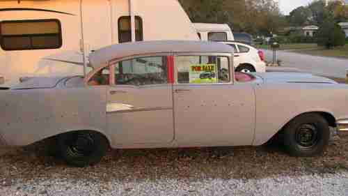 This is a 1957 Chevy Belair, Have all the chrome for the car, has extra front and rear bumpers, needs interior re-done, has front and rear seats, needs headliner, has headliner rods. Floor pans have been redone by previous owner, only thing I've done since I owned the car is body work, no major damage (NOT a bondo bunny , cut out and replaced with metal). Runs and drives! Ran out of time to finish it. Color is Grey primer. Also it has all the molding clips to put the chrome back on. It does need the front windshield, does have the back windshield, but needs rubbers for the front and rear. Car has no brakes, bad master cylinder, but have rebuild kit for the master cylinder.