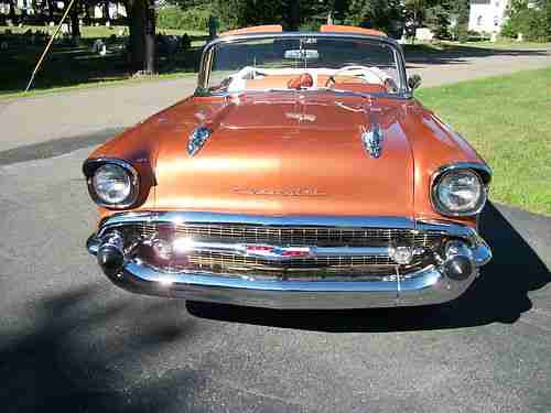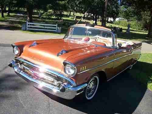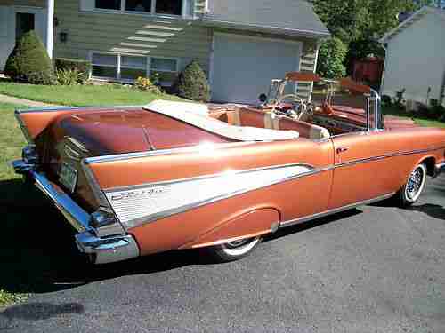 1957 CHEVY BELAIR CONVERTABLE 6 CYLINDER RUN VERY SMOOTH CAN DRIVE ANYWHERE VERY DEPENDABLE ,2-SPEED POWERGLIDE TRANS BEAUTIFUL SERRIA GOLD PAINT NO RUST NICE FRAME PAINTED BLACK RUST FREE ALL MECANICAL IN WORKING CONDITION NEW TIRES ,INTERIOR AND TOP IN REAL NICE SHAPE CAR HAS FENDER SKIRTS ITS AN ALL AROUND NICE CAR YOU MUST SEE THE CAR IN PERSON IT TURNS ALOT OF HEADS AT CAR SHOWS WE HAVE A 327 FOR THIS CAR IS YOU WOULD LIKE TO HOT ROD IT UP THAT RUNS AWSOME THAT CAME FROM HENDRICK PREFOEMANCE FOR AN EXTRA 2,500 THE BUY IT KNOW PRICE WILL BE 57,000, IF YOU WOUILD LIKE THE 327 IT WILL BE 59,500 THANKS YOU SERIOUS INQUIREY ONLY HAD ENOUGH OF TIRE KICKERS. FOR MORE INFORMATION CALL JOE AT 570-335-0958