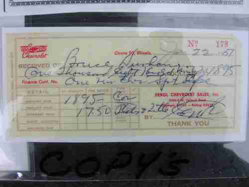 THIS 1957 CHEVROLET WAS PURCHASED JAN. 22 1957 AT BERGL CHEVROLET IN CICERO IL. THIS IS THE MOST ORIGINAL AND DOCUMENTED 57 BEL AIR YOU WILL PROBABLY EVER FIND UNRESTORED!! ORIGINAL BLACK FACTORY PAINT, BLACK AND SILVER FACTORY MATERIAL INTERIOR,ALL ORIGINAL SHEET METAL NEVER PATCHED, NEVER IN AN ACCIDENT. IT NOW HAS 45700 ORIGINAL MILES. 283-220 HP POWER PAK ENGINE, 3 SPD TRANS. EVERYTHING ON THIS CAR IS NUMBERS MATCHING UN TOUCHED!! THIS CAR HAS BEEN IN STORAGE SINCE 1962!! IN 2012 IT WAS COMPLETELY SERVICED , NEW BRAKE LINES, GAS TANK, COMPLETE EXHAUST, CARB WAS REBUILT. A SAFER DUAL MASTER CYLINDER WAS ADDED. IT STILL HAS THE BIAS PLY TIRES THAT WERE PURCHASED FROM SEARS ROEBUCK IN THE EARLY 60s. THIS CAR RUNS AND DRIVES LIKE NEW!!! THE ONLY RUST ON THE CAR IS ON THE LOWER PASS. FENDER AS PICTURED. THE CAR WAS UNDERCOATED AT THE DEALER IN 1957. IT HAS DEALER INSTALLED P. B. RADIO, WINDSHIELD WASHER, AND UNDERCOAT. THIS IS THE MOST ORIGINAL UNRESTORED AND UNMOLESTED VIRGIN DOCUMENTED 1957 CHEVY BEL AIR THIS CAR WOULD MAKE A GREAT ADDITION TO ANY COLLECTOR OR TO ANYONE THAT IS LOOKING FOR A GREAT INVESTMENT!!! I AM LISTING THIS FOR A FRIEND IF YOU HAVE ANY QUESTIONS YOU CAN REACH HIM AT 630 -392 -3270 SHIPPING IS THE RESPONSABILITY OF THE BUYER BUT WE CAN ASSIST IN LOADING. ANY BIDDERS WITH 0 FEEDBACK MUST BE APPROVED BEFORE BIDDING OR THE BID WILL BE CANCELLED. A NON REFUNDABLE DEPOSIT IS REQUIRED WITHIN 24 HOURS AFTER THE AUCTION OF 1000.00 DOLLARS THIS VEHICLE IS ALSO BEING OFFERED LOCALLY AND IS LOCATED IN BARTLETT IL.