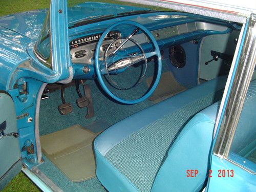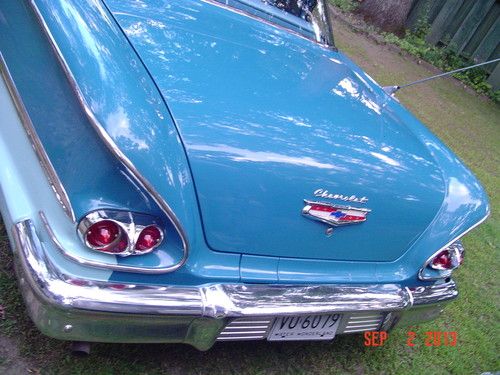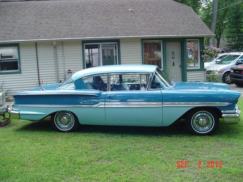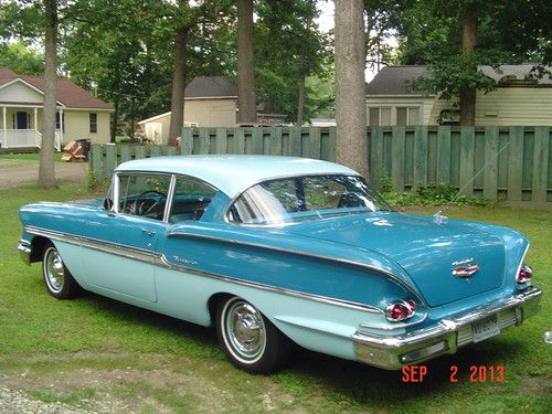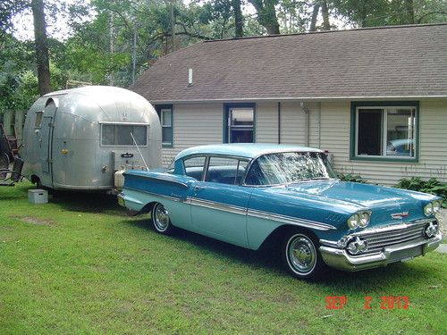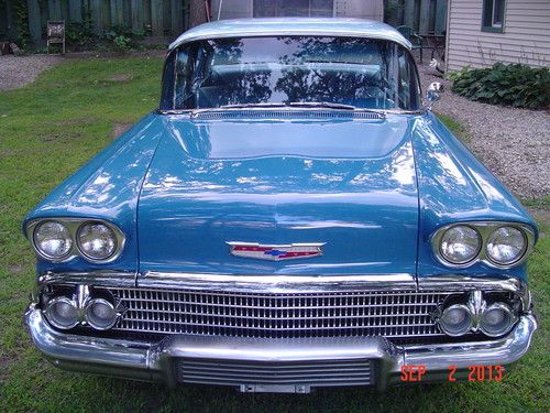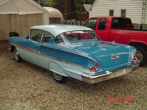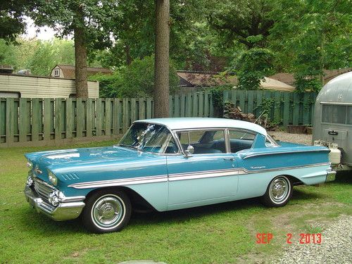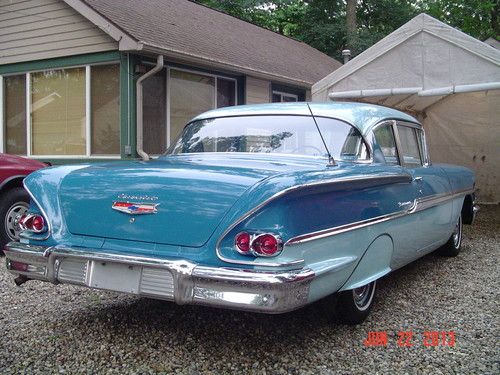For sale is a very nice unmodified original 1958 Chevrolet Biscayne 2 door sedan. I'm very hesitant to sell this car but I want to put air ride and Fenton speed parts on it and everybody says leave it alone. Here's your chance before I violate it's originality. I had my eye on this car for a couple years and last year I went after it and bought it. The interior seat covers were original and the front had worn through and the front seat foam was starting to break down. I pulled the seats and had brand new stock seat covers put on from CARS INC., I also had the seat foam and burlap replaced front and back. I wanted it to be as comfortable as new again. While apart, new factory style carpet was installed, I replaced the original kick panels with new and a new rear package tray was also put in. Door panels are original and still look pretty nice. The dash is all original and very nice and has it's radio delete plate, the owners manual is still in the glove compt. All gauges look nice and all function, the odometer still works but the speedometer does not, so it's something in the head. Mileage is listed as original on the title from the DMV in Indiana and from the overall wear I'd say it is. Every other thing on the car works, steering wheel, pedals and all trim looks very clean, car definitely appears to have been very well cared for and preserved since new, and must have been kept out of the elements. All wiring is original and never been cut or cobbled. All weatherstripping appears original and still soft, door jambs still have original paint as does the trunk and is still very clean. Original horn sounds like a freight train coming and you can scare the bjesus out of someone. Master cylinder was just rebuilt and all brakes were gone through, bearings packed and all new brake hoses within last hand full of years. Clutch works perfectly and trans shifts like new, car drives like it did back in 1958. The 235 Six cylinder runs very nice and has automatic choke and fires right to life up on fast idle when cold. All sheet metal appears original, inner and outer rockers and trunk pan are very solid, floors have had a couple small patches welded in at some point and didn't appear to need any more than that. All exterior sheet metal is very nice, slight amount of work done above the headlights was done back when car was repainted but must have been very minor pitting, no evidence of work when looking from inside the fenders at the back of the headlights. That was probably 15-20 years ago and there is very small bubbling in that area only. Paint presents itself nicely for a couple decades old with no fading but does has some minor touch up here and there. It's no longer show paint but is very nice driver quality. Still has one original T3 headlight. Under hood is very clean, firewall has original paint, underside of hood was sanded and repainted back when and still looks new. Trunk is all original and clean, minimal surface rust under original trunk mat, underside of deck lid clean and still has spare tire instructions on it, jack and all hardware is there with newer radial spare. Original wheels with radial tires make the car drive great and I wouldn't be afraid to drive this car anywhere. Front bumper section is faded but the rest is nice and the car is overall very clean, and has always been well maintained. It also comes with matching fender skirts but that's not my style. The Airstream in the photo's is not for sale and is not hooked up to the car, I just wanted it in the picture. I really, really hate to give this car up, I was born in 58 and I'm a Chevy guy. I'll probably never be able to afford one in my price range again, I just have too many toys, I'm getting older and need to simplify my life a little. Indiana title is clear.You are welcome to come look at the car before auction ends. Please do not bid if you have less than 10 transactions and 100% positive feedback or I will cancel your bid. Sorry, just been burned a few times over the years and it's cost me plenty. I've tried to describe everything as accurately as possible, I will update if I've forgotten anything. Please ask questions if you feel the need. There are no guarantees on this 55 year old car. Auction can end at any time, I prefer cash. Good luck and thanks for looking!