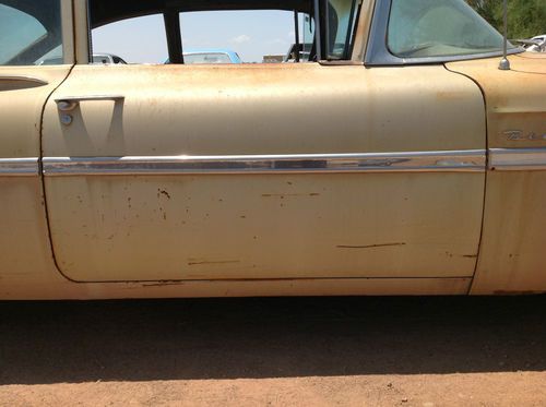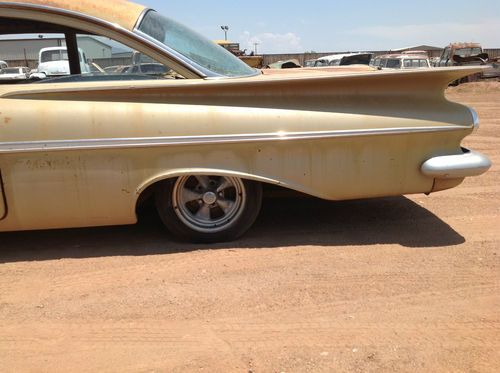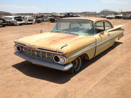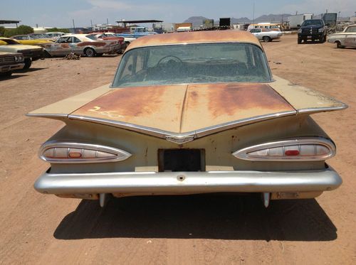 This is a 1959 Chevrolet Bel Air 2 door coupe just rescued from the Arizona desert. It has (I believe) a 283 2 barrell engine with Powerglide transmission. It is not currently running and hasn't for over 30 years. You will look long and hard to find a better unrestored body. Most glass is intact, except the passenger door glass. Drivers door glass is cracked. The floor pans look ok from underneath, but I havent taken the carpet out. Will need spare tire well pan, as I can see there is rust through there. It is a power steering car. Engine compartment looks very complete. Will need interior kit due to the Arizona sun. If you have other questions, please call 435-770-3337.
