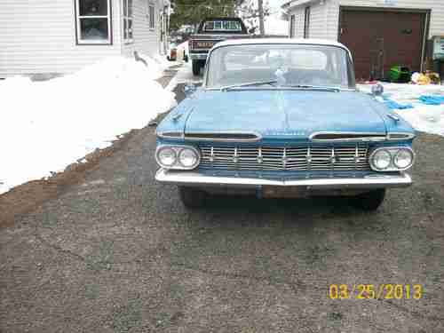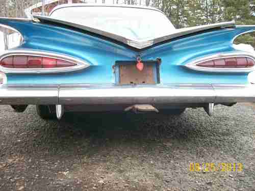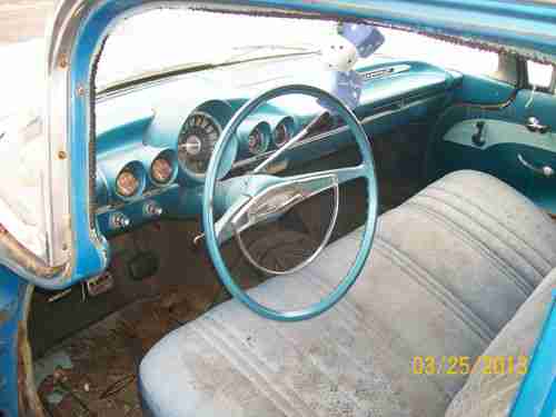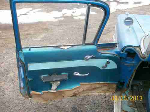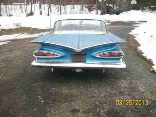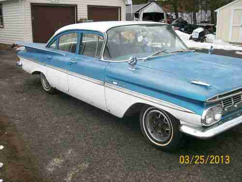 Here for bids is a very restorable 1959 belair four door sedan. It will need a new floor pan and rocker panels, the trunk floor is pretty good and the body mounts are good, frame is very good, the doors dont sag they shut solid. the windsheild is cracked, the rest of the glass is good. The 235 6cyl. runs good, three speed shift on the column, the brakes work some, they will need to be bled. I bought this car last summer to restore, now i found out i have to pay a lot of taxes so i need to sell this car. I never had it on the road to drive since i live in town, but drove around the yard and the clutch works good, tail light wires will need repair i didnt get to them, Also i have the correct rims for this car with the nubs for the original style hub caps i have, the rims are sand blasted and ready for your paint. Has new radial tires. I have the original owners manual and i bought all the books and brochures for this car. This is the first time i put a car on ebay to sell so bare with me I will answer your questions. I can always email you more pictures. Car was originally from jamestown ND. the floor rusted from the inside out from the carpet nap probalby. Car was made in janesville WI. Thanks. Note: not sure of the mileage says 39000 but probably is over 100000.