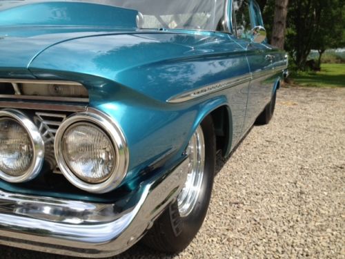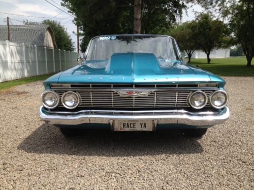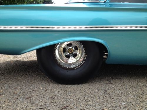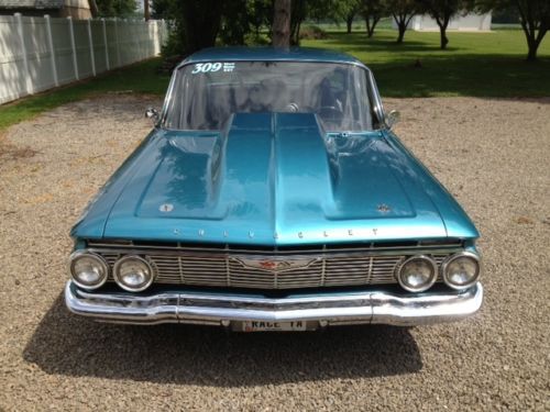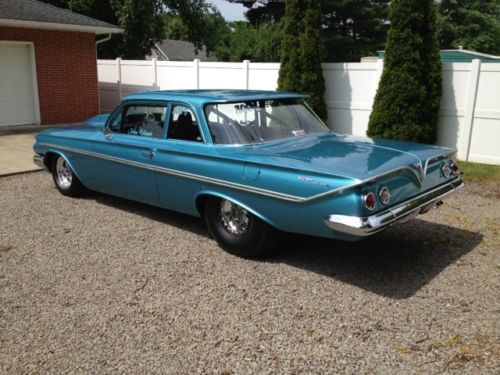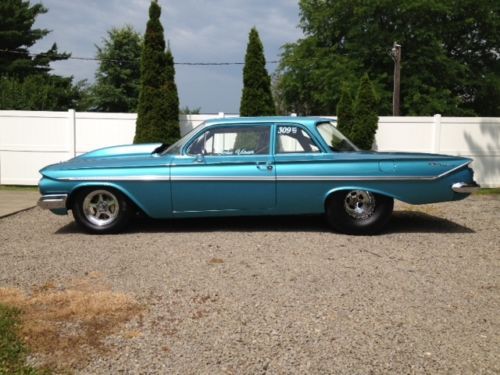 1961 Chevrolet BelAir Post, Show Quality Full Tube Chassis Race or Pro Street Car, all steel body with custom 5" fiberglass bolt on cowl hood, hood and trunk utilize factory hinges...car has all real glass windows, stock dash, lights, etc...Scott Shafiroff 515cu" BBC, Callies Crank, Oliver Billet Steel Rods, Solid Roller Valve Train, Brodix Heads, Pro Systems Dominator, MSD ignition, Fabricated Sheetmetal Valve Covers, custom ceramic coated headers, Aluminum Radiator, Brand New Carl Rossler TH400 with RossLoc trans brake, Ultra Bell, Billet Drum, Deep Pan, Brand New FTI 8" Torqe Converter, Narrowed Dana 60 rear housing with brand new Mark Williams 40 spline spool, axles, and 4.88 gears...Ladderbar Coilover rear suspension, Billet Specialties Comp 5 Polished Double Beadlocks with Mickey Thompson 32x14.5 Slicks...Aluminum Fuel Cell, Dual Batteries, BG400 Fuel System.....Car is Professionally Wired with a K&R Super Duty System, Delay Box, C02 Cheetah Shifter.....rack and pinion front end, drop spindles, tubular a-arms, Mark Williams Disc Brakes....Beautiful Straight Twilight Turquois basecoat/clearcoat paint by Aman's....Car weighs 3,460lbs and went 6.13 at 112mpg...Car title with VIN in tact...car could easily be put on street if desired...far far too much to list...NO DISAPPOINTMENTS!!!!! 330-418-7210