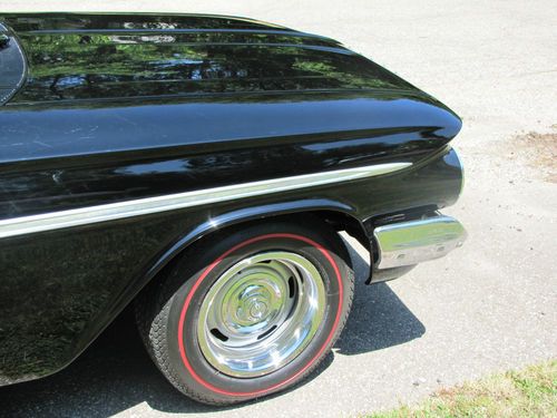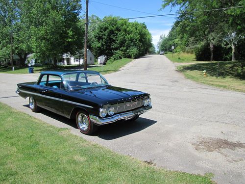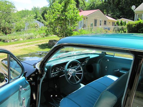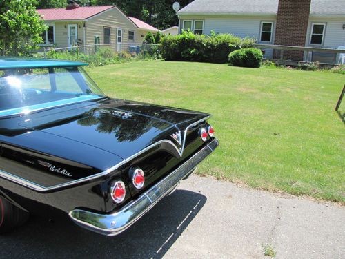 1961 Chevy Bel Air 2 dr. Sedan. Got car in a trade. Recent restoration. Straight body painted black with green top. Trim appears to have been polished and straight. Bumpers could use a rechrome, they are straight and dent free. Good for a driver. Turquoise interior with new seat covers, headliner, carpet and package tray. Door panels and kick panels also appear new. Car has Corvette rally wheels with Mickey Thompson red line tires. Car is very well detailed. During restoration front passenger floorboard was replaced. All lights and gauges work. As does wipers and heater. Rear tail lights have been converted to LED. Cars only needs are radio, it does not work and needs a speedometer cable (it jumps).