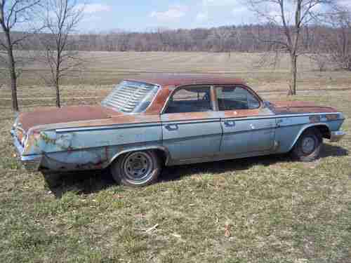 1962 CHEVY BELAIR RUNS AND DRIVES ,FOR PARTS OR RESTERATION. DOES RUN OFF A AUXILLARY TANK AS THE ORIGINAL HAS VARNISHED FUEL IN IT.BOTH ORIGINAL BACK WHEELS AND HUB CAPS WILL BE INCLUDED WITH CAR, I PUT ON THE MUD AND SNOW TIRES TO MOVE THE CAR FOR PICTURES. WILL NEED BRAKE LINES AND BRAKE WORK ALSO AS IT HAS NO BRAKES. ALL GLASS GOOD EXCEPT WING VENT GLASS, ONE IS CLOUDY AND THE OTHER IS CRACKED. FLOOR BOARD IS GONE ON THE OUTER DRIVERS SIDE. ENGINE IS A 235 6 CYLINDER THAT RUNS GOOD BUT IS SMOKING SOME AS CAN BE SEEN IN PICTURES.GOOD LUCK AND THANKS FOR LOOKING.