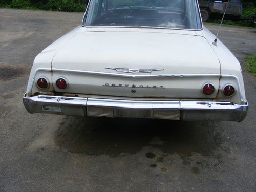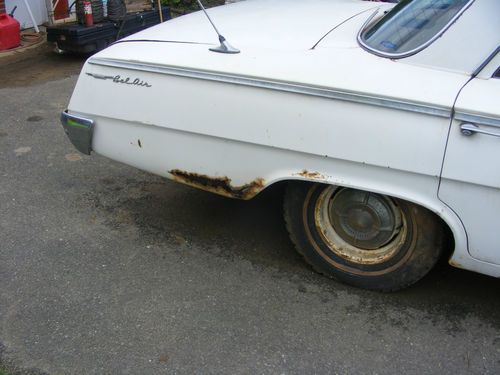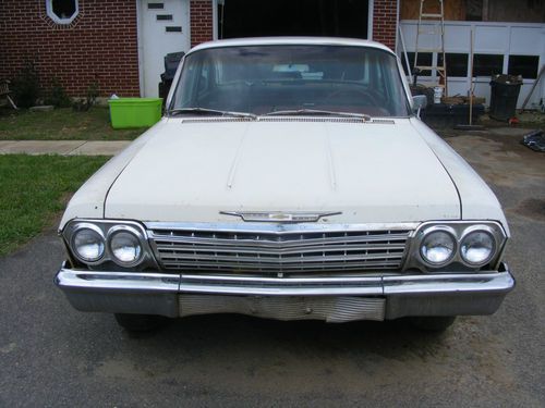 YOU ARE BIDDING ON A 1962 CHEVROLET BEL AIR. IT HAS 136,461 MILES . I THINK IT HAS A 2 SPEED POWERGILDE TRANSMISSION AND 283 ENGINE . IT WILL START AND DRIVE. IT NEEDS A GOOD TUNE UP. I WOULD NOT DRIVE IT HOME UNTILL THEN. VERY NICE INSIDE. THE SEATS DO HAVE SOME RIPS IN THEM. CHROME INSIDE IS GREAT. THE WINDSHILD IS CRACKED. VENT WINDOWS HAVE SOME BUBBLES. ALL LIGHTS WORK HORN STICKS. POWER STEERING . GAS TANK WAS DRAINED. IT HAD OLD GAS TAKEN OUT. NOT HOOKED BACK UP. PLEASE EMAIL ANY QUESTIONS.CALL FOR MOR INFO.. 1 540 420 1241.THIS IS A VERY GOOD LOOKING CAR ON THE INSIDE AND THE DOORS CLOSE GOOD AND TIGHT. GREAT LOOKING CAR ON THE INSIDE. ALLSO IT HAS REAR DEFROST. GOOD REAR ANENNA. DRIVERS DOOR WILL NOT OPEN IT WAS AND SOME THING COME LOOSE ON THE INSIDE. I DO NOT WANT TO LIST ANY MORE. NEEDS NEW HOME.