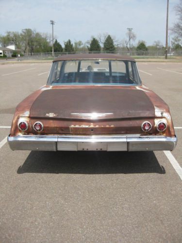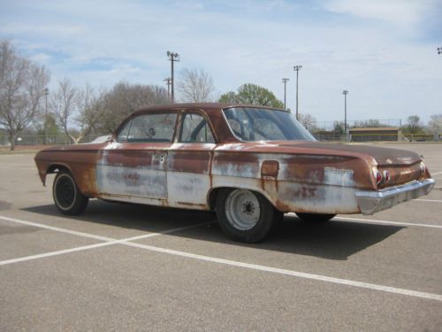 1962 Chevrolet Biscayne 2 door sedan. Set for drag racing. 454 motor automatic tranny. Vintage style. The story on the car is , I bought a '62 Bubbletop that was set up for drag racing. I wanted the bubbletop body to restore to original. So i also bought a 2 door sedan and swapped the bodys. Put the sedan body on the drag chassis and the bubbletop body on the sedan stock chassis. Im not a drag racing guy. The bubbletop was running 12.20's in the 1/4 mile. Does have a clear title. New tubes in the rear but need a good set of slicks. I put some ols wide ovals on so it would roll and drive up and down the street. Dont know all the details on the motor build. Was told its a 8 3/4 mopar posi track rear end .Wrap around frame headers reubilt 850 double pumper holley, rebuilt holley fuel pump. Also needs a quick release for the steering wheel. You can come see , hear and drive the car. Starts runs , drives and stops. I rebuilt all the body mounts before body was installed. I had a 4 door parts car and cut out floor pc's to repair rust. The outside has a great patina . Some small rust around the wheel well lip. Not bad tho. Would be fun to go smoke some of the painted cars at the track. BUYER PAYS ALL SHIPPING COST. I RESERVE THE RIGHT TO END MY AUCTION EARLY BECAUSE ITEMS ARE FOR SALE LOCALLY. THANK YOU AND GOOD LUCK BIDDING. A NON REFUNDABLE DEPOSIT OF $500 DUE WITHIN 2 DAYS OF AUCTION END. BALANCE DUE IN 5 DAYS. NO EXPRESSED OR IMPLIED WARRANTY. 316-734 2499 Phone # for serious inquirys.