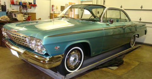 This is the BEST 1962 Bubbletop Bel Air in the United States! This is a two owner car that was fully restored by its current owner. The complete history of the car goes to the new owner. The work is over the top, beyond anything I have ever seen from a single individual. Most of the work was done using NOS parts and restoration of orginal parts including the restoration of the original fasteners. The underside of the car is just as clean as the outside. The car has only been cleaned with bottled deionized water, check out the bags on the pedals in the pictures this should give you an idea of the meticulous care that went into this car. Also note the lines on the upholstery in the interior, which was all hand fitted and stiched. I'll let the pictures speak for themselves. This car was also acheived a gold spinner award at the Chevy Vettefest in 1997. The only issue with the car is that it started life as a six cylinder/glide Bel Air, but all the numbers match as if it were an original 409 4-speed car. Any questions please call (614) 579-2506 8am-10pm EST.