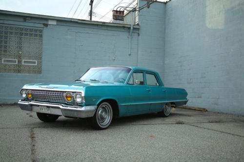 super clean 63 belair 4 door for sale. I bought this off the original owner 2 years ago. It's an Arizona car, no rust ever. 64000 original miles, it was painted about 15 years ago and still looks great. Original chrome on the bumpers is in really good condition. All the stainless and aluminum trim is in great condition. Original floor pans. It's a factory ac car. There is a small leak in the system that will have to be fixed for it to blow cold. It needs a new heater core, and there is a rip in the front seat back. It's a 283 2 bbl with power glide and power steering, has new power steering lines. It has air lift easy street air ride suspension with digital controller. ride tech rear tubular trailing arms, upper arm and adjustable panhard bar. Ride tech shocks all the way around. Rear end has been rebuilt with all new seals and has a fresh coat of black paint on it. All new u joints and billet urethane carrier bearing. Has new alternator, fuel pump, carb and wheel cylinders. 15x7 Chrome steel wheels with diamondback custom triple white wall tires and stock dog dish hubcap. Has factory back up lights that work, there is a red lens over them now but can be changed back. All lights and turn signals work. speedo works, fuel gauge works, there is a new fuel sending unit in the tank. it has an old 3 gauge pod mounted under the dash with oil pressure, water temp, and a tach, the tach and lights for the gauges still need to be hooked up. it has old accessory sun shades that pull down on the side windows. headliner and rear seat are perfect. this is a great car that you can drive anywhere. I am located about 20 mins north of Detroit. Car is sold as-is with no refunds please ask any questions you may have before bidding. good luck and happy bidding |