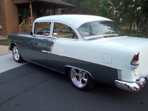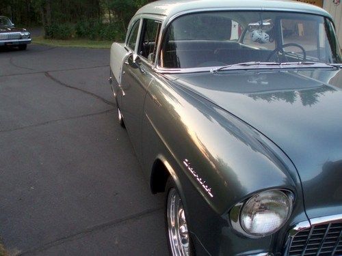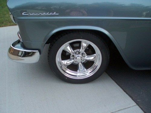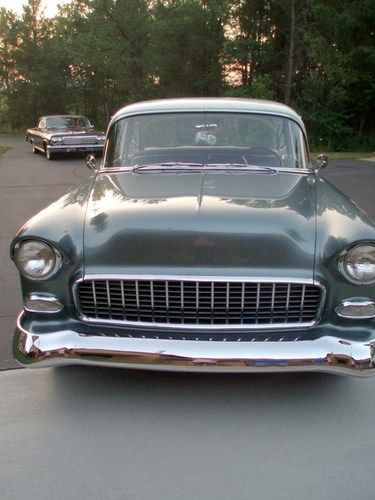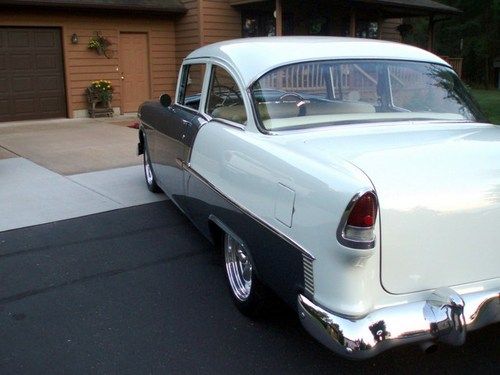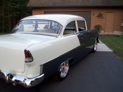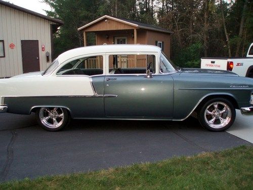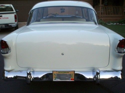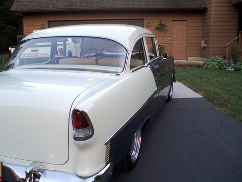 1955 Chevy 210, 2 door. This is one of the nicest 55 Chevys you will ever see. Never has had any rust. 200 miles since done. Everything New. 350 chev motor, 350 transmission. 373 gears and 605 power steering box. New brake booster and Edelbrock 650 electric choke carburetor. 2" drop spindles and disk brakes, 2 1/2" flow masters. 17" wheels with new radials. Shocks and springs all new. All new front end parts. All new chrome, 1 piece front California front bumper, new Nomad rear bumper. New 55 Chevy smaller steering wheel. New black and white Del Ray interior. One of the nicest paint jobs from high end body shop with a cost of $10,000. Immaculate paint. Looking down the side of this car is the straighest and original body you will ever find. I left the old paint in the trunk under the mat to show the original floor and paint. This car has much more than listed and runs and drives down the road like a brand new car. Pictures will show you what the car is. Have $50,000 in receipts. The reserve is well less than I have in receipts and labor. Drive anywhere, any time. You are welcome to see the car in person. Jim 715-579-9494.