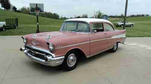 1957 Chevrolet 150 - 2 door sedan. Canyon Coral with black interior. Very solid original car that runs, drives, and looks very good overall. Not a show car, but a fun driver. Motor is stock 6 cyl with 3 speed manual transmission. Manual steering and brakes. It starts right up and runs cool. Chrome and trim all in good shape. Tires are bias ply black walls with prob 70% tread or more left. No frills, plain Jane 57.