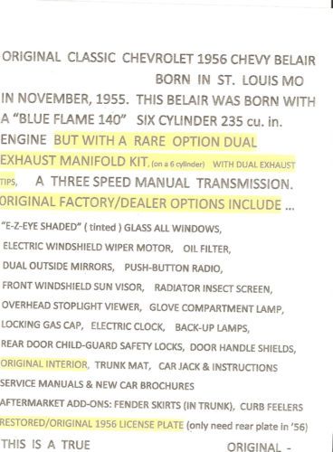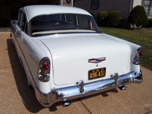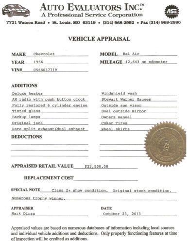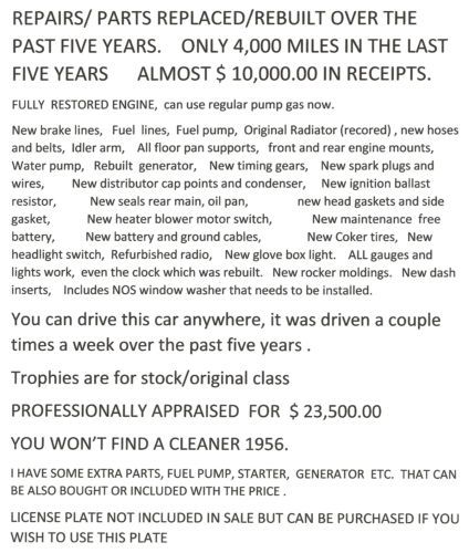 Beautiful, Restored, Numerous Trophy winner in stock/original class. Appraised at $ 23,500. This is a 1- or 2+ show condition classic but not a trailer queen, driven a couple times a week over the past five years of restoration. About With just a few touches, could be a # 1 condition classic bringing 27K to 29K, or just enjoy as it is. . Fully restored 235 cu.in. 6 cylinder "Blue Flame 140" engine. with a RARE option dual exhaust manifold w/ dual exhaust tips, sounds great and adds a little more get up and go !!! (this option was put on by a dealer and it was the dual exhaust manifold off the 1955 Corvette 6 cylinder) Only about 2000 miles since engine rebuild. Can use regular unleaded gas. Three speed on the column transmission. Beautiful interior, mostly original but some restoration, Excellent chrome and stainless. Can drive anywhere. $ 10,000.00 in repairs/restore receipts. Has unusual options as seen on the list. If your looking for a true original/stock classic tri 5 Chevy this is the one,. Does not go out in the rain and garaged and covered. There is slight wear on the front and rear seats but no tears or rips, headliner is excellent, chrome is excellent except for a one inch area on the front bumper seen in picture, no rust, does not burn oil or smoke.. All gauges and lights work. Car did not have a frame off restoration but pretty close Hate to see it go but have other responsibilities that need attention. Paypal account required, $ 1,000.00 non-refundable deposit required within 24 hours, total purchase price. must be paid in full within 7 days of auction close. Car will not be released until cash is paid or funds clear my bank. Please ask as many questions as you like and you are urged to get an inspection before bidding. Clear Missouri title. Car is sold on an " AS IS " basis with no warranties, written, expressed or implied. This is a final sale. NOS windshield washer IS INCLUDED in the sale, needs to be installed. Also have a working generator, starter and rebuilt fuel pump that IS NOT INCLUDED IN THE SALE but can be included depending on your offer for the car. Car is also advertised locally and if sold before auction ends I will end auction without any current bidder's recourse. No trades. Car is available for inspections 7 days a week 9 AM to 6 PM. Prefer emails but if necessary call with questions at 314-846-6269 between 10AM and 6 PM CST. Thanks for looking and have a great day. Reserve is lower than the Appraisal