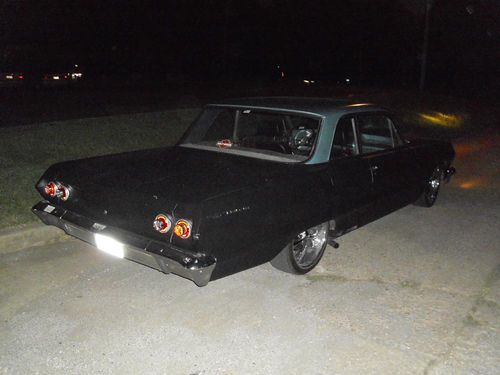 1963 Belair 2 door post pro touring style all new suspension and tires and wheels wilwood front disc brakes delphi power steering box tubular upper and lower control arms adjustable front coil overs hotchkiss from stabilizer bar tubular rear lower control arms 2 inch drop spindles lowering coils front and rear aluminium radiator transmission cooler new dual exhaust 20x10 Boss wheels front and rear with tires to match new Pro Car bucket seats complete new trunk bottom great repair on floorboards Edelbrock intake and carb pretty solid old car with a very sinister look to it runs and drives great all of this stuff listed is correct to my knowledge. there could be some stuff attatched to the car that I missed and I could be wrong about some of the stuff I described as being on the car. if you buy the car you be lucky either way. it runs and drives great. yes those big tires on the from rub if you turn to sharp. you must have a verifiable Paypal account to bid. and a minimum of 10 positive feedbacks. if not your bid will be canceled. $500 non refundable deposit at time of winning auction. any questions please e-mail or call me 405-414-1503 thanks a bunch