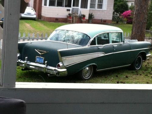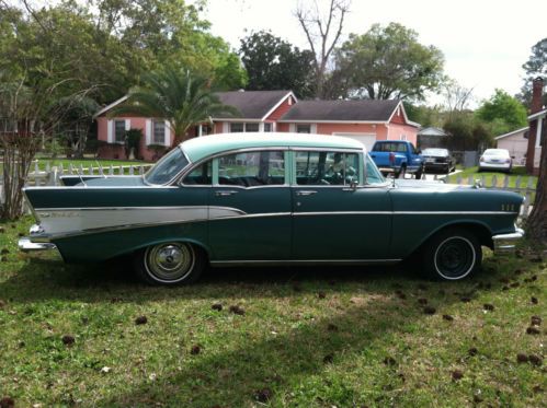 Classic 57 Bel Air 4 Door. Body and interior in very good shape. Lower body Dark Green needs repaint. Sea Foam green roof looks like new. Engine is rebuilt 283 original motor with Elebrock 4 bbl carb. Car is 90 percent unrestored and in great condition. Location Jacksonville, Florida I have had for two years Has had front brakes changed sill single resevoir master cylinder Contact Dave at 727 992 4797 for info