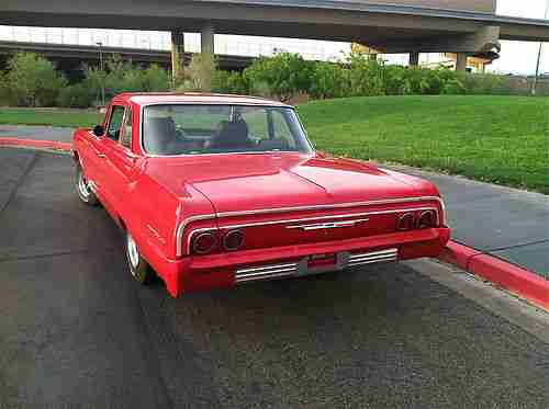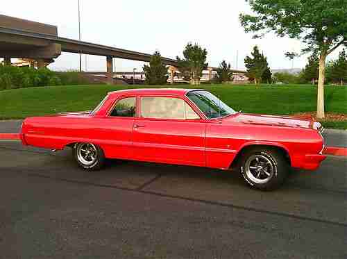 UP FOR AUCTION IS A REAL SHARP 1964 BEL AIR HOT ROD THAT HAS HAD A RECENT FRAME ON RESTORATION WITH A COMPLETE FILE OF THOUSANDS OF DOLLARS IN RECEIPTS AND PHOTOS OF THE BUILD. THIS CAR IS COMPLETELY RUST FREE. THE CAR ODOMETER WAS SET TO ZERO WHEN THE BUILD WAS FINISHED TO REFLECT A NEW BEGINNING, THIS IS AN ORIGINAL V-8 CAR THAT HAD 77K MILES ON IT. THIS CAR HAS A BRAND NEW 350CI/330HP FOUR BOLT MAIN CRATE MOTOR, REBUILT 400 TURBO TRANS, BRAND NEW IN THE BOX A/C UNIT (will be installed this weekend), LEATHER INTERIOR WITH POWER FRONT SEATS, GORGEOUS RED METALLIC PAINT, NEW TIRES, BRAKES, AND JEGS WHEELS. THE LIST OF NEW ITEMS GOES ON AND ON. THIS CAR RUNS AND DRIVES GREAT. VERY SOUGHT AFTER CARS, IF YOU WATCHED THE MECUM OR BARRETT JACKSON AUCTION YOU KNOW WHAT THESE CARS ARE SELLING FOR. PLACE A BID OR MAKE AN OFFER AND IF YOU HAVE QUESTIONS FEEL FREE TO ASK BY EMAILING ME THROUGH EBAY OR AT RONZZ100@AOL.COM OR GIVE ME A CALL 702,513,7885. BUYER PAYS FOR TRANSPORT OR CAN PICK IT UP AND DRIVE IT HOME. GOOD LUCK!!!!! I RESERVE THE RIGHT TO END THIS AUCTION EARLY AS IT IS FOR SALE LOCALLY.