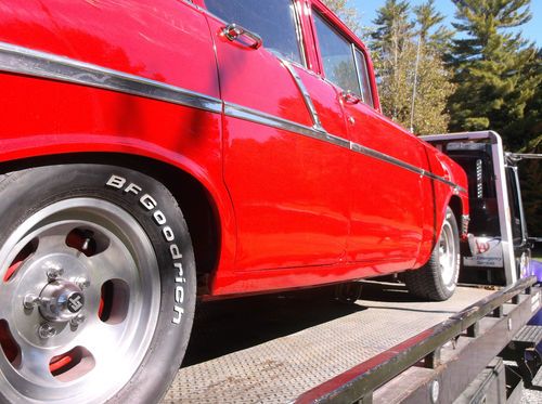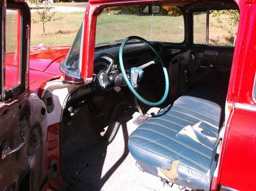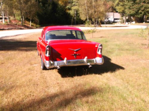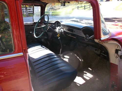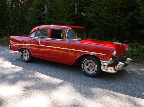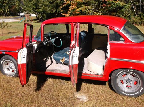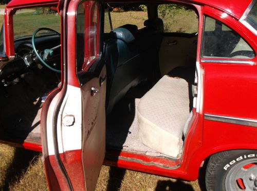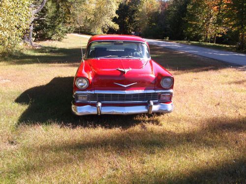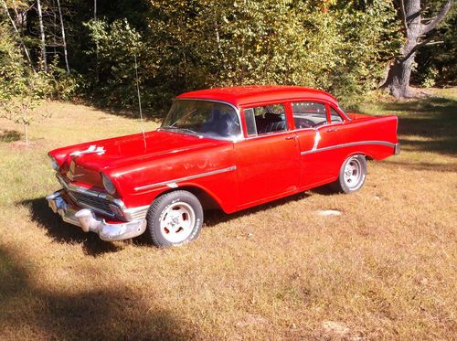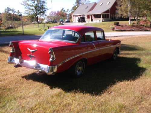 LOOK!!! 1956 CHevy Belair 210 4Dr. OLDSKOOL V8 Hotrod!!!!! This Chevy was Built YRS ago and has held-up REAL WELL!!!! 350 V8, Auto with Dual Exhaust and a Chevy R-end THAT!!! Runs, Drives, Stops and Goes Down the road REAL NICE!!!!! Motor sounds GREAT and Tranny Shifts SMOOOOTH!!!! This is just a Nice OLD CHEVY!!!! Body has held-up GREAT, Doors, Quarters, Lower Fender, ETC are solid, Frame and Trunk and Body mounts and supports ARE Excellent for a 56 Chevy. The car was painted a couple of yrs ago and still looks great!!!! Rocker panels were replaced. The Chevy has a new gas tank, new starter, All new Brakes and MORE!!!! Nice Tires, Nice Exhaust The Interior on the Chevy is all there BUT needs to be redone, No Headliner, or Dr. Panels, Real nice Dash, This Chevy needs very little TLC Very Little, Ready to Cruise!!! Being sold with A BILL OF SALE ONLY!!!! New Hampshire will not title after 15 YRS> Some of the flat dr. glass is cracked. Very Low reserve!!!! Bid to own Happy Bidding!!!!!