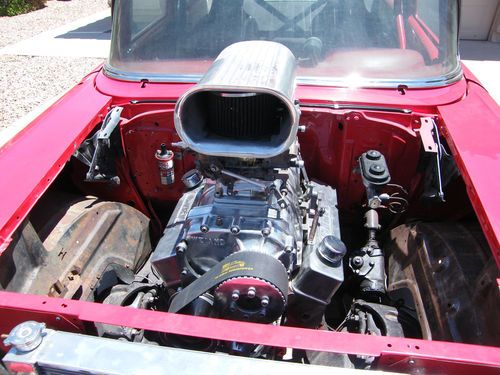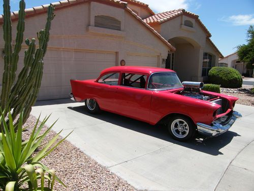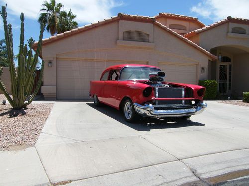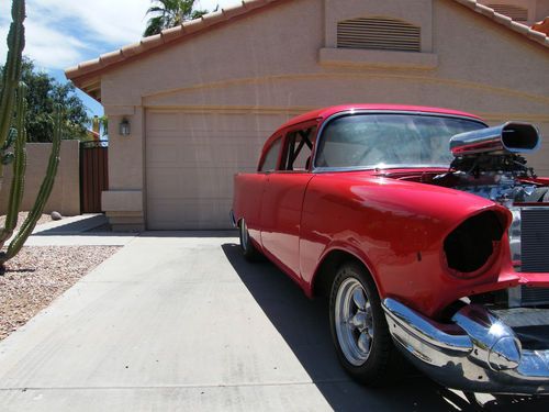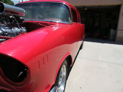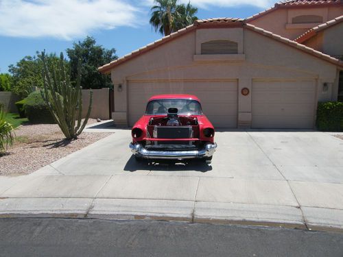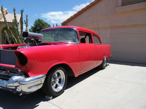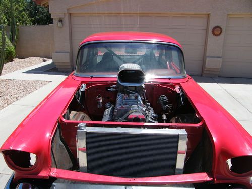 1957 chevy. it has a chevy 400 with a turbo 350 and a 671 blower. this car was a 60s drag race car at lions drag strip. it has a danna 60 rear end, aero space disc brakes, aluminum drive shaft, new chrome ,weather stripping and a new grill. tires are good. this car was a 9 second car and the cam went bad. needs a rebuild. other than that the engine is good. the pistons and crank shaft are in good condition and were not hurt. the only thing that was damaged were the berrings. this car has a new aluminum radiator and fans. it is a great looking car. you do not see a blown pro street 57 chevy everyday, let alone, one for sale. check out the pictures. happy bidding.