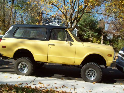 1972 CHEVROLET BLAZER 350 AUTOMACTIC DUAL EXHAUST CLEAR MD TITLE RUNS AND DRIVES GOOD IT IS A FULL CONVERTIBLE IT HAS A NEW TUNEUP , PLUGS,WIRES, DIST.CAP.IT HAS NEW BATTERY NEW FUEL PUMP IT HAS A NEW STEERING COLUMN INSTALLED, USED. IT HAS NEW CHROME WHEELS WITH 33" TIRES, TIRES ARE NOT NEW THIS TRUCK HAS NO RUST NO RUST IN THE FLOORS NO RUST IN ROCKERS NO RUST IN THE TAILGATE IT HAS NO RUST IN WHEELWELLS NO RUST IN QUARTERS OR FENDERS A VERY SOLID TRUCK IT HAS A 4" SUSPENSION LIFT AND A 3" BODY LIFT THE LIFTS ARE BOLT ON SO COULD EASILY BE REMOVED ALL THE GLASS IS GOOD AND WORKS NO CRACKS IN THE DASH NEEDS SEAT COVERS, ONE DOOR PANEL FOR DRIVRES SIDE. EVERYTHING WORKS, THE LIGHTS, THE TURN SIGNALS, THE HEAT , THE WIPERS ALL THE GUAGES WORK. IT HAS LOCKING FRONT HUBS THAT MOVE FREELY4WD DRIVE WORKS GOOD THIS A SOLID VERY NICE RUNNING AND DRIVING CLASSIC TRUCK THAT IS A FULL CONVERTIBLE DONT MISS YOUR OPPURUTUNITY TO OWN THIS CLASSSIC 0 FEEDBACK MUST CONTACT ME FIRST OR YOUR BID WILL BE CANCELLED 1000.00 DEPOSIT DUE A 24 HRS AT END OF AUCTION IT IS FOR SALE LOCALLY
