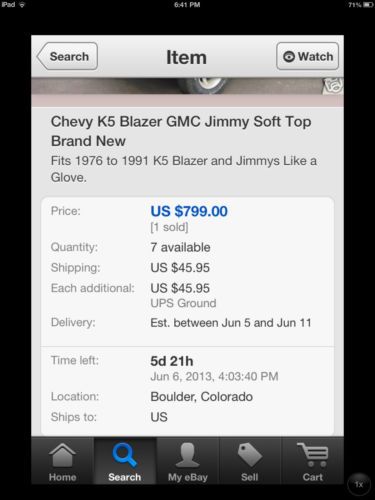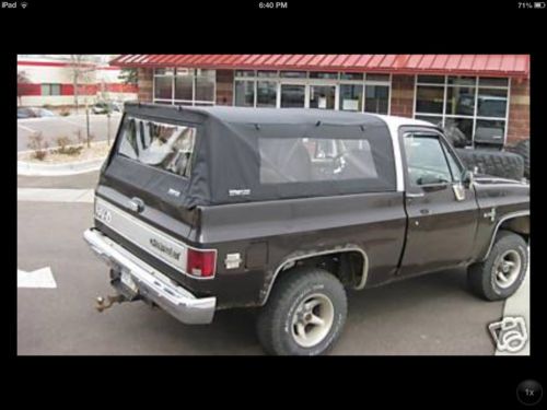 I HATE TO ADMIT THAT I HAVE OVER 13K INVESTED IN THIS TRUCK YOU CAN BUY IT NOW FOR LESS THAN HALF OF THAT. Blazer is extremely road worthy and although I cannot warranty it I feel that it could be driven anywhere. I lost my eyesight and ability to drive Doctors thought they would be able to restore it so I started to have this blazer built After many operations it was not meant to be So I am putting it up for auction This is a 1976 Chevrolet K5 2WD Blazer that needs to be finished I have installed a Crate ZZ383 motor (see the GM website for all manufacturer specifications) Chevrolet 700r4 4-speed automatic floor shift transmission 23" Lokar floor shifter New, never installed SoftTopper convertible top Photos of Blazer with convertible top installed is not my blazer I copied them from the website for illustratrion purposes only Almost new matching set of tires New shocks New custom made drive shaft New braking system including rotors, pads, shoes, break lines, and master cylinder New radiator New power steering pump All new hoses and belts MSD ignition set New Holley 650 CFM carb New K&N air filter All new items on this truck have less than 300 miles of use ( My brother comes over and drives it for me occasionally while I ride. ) The truck performs flawlessly. You can leave it as is and have good daily driver or replace the dash pad, the carpet, speedometer cable, fuel sending unit, and finish up exterior rust spots and paint and have a truck that looks as good as it drives. Truck has approximately 70,000 original miles but since I don't have a speedometer cable hooked up to it I'm selling it as miles unknown. Truck originally had air conditioning but when I replaced the motor I did not re-install the air conditioning components. If you want AC you will have to install a new system. I am selling a lot of my toys that required eyesight to use so check out my other auctions. I will be adding two metal detectors and extremely high end audio equipment that is a little too complicated for me to work THANKS FOR LOOKING. CHECK OUT MY OTHER AUCTIONS. |