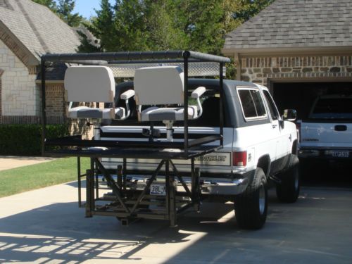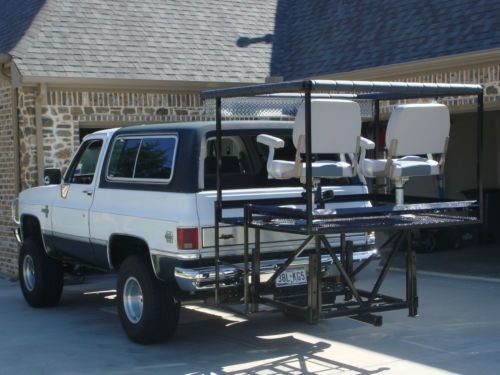1985 K5 Blazer w/ 350 four bolt main, four barrell carb, 7,000 miles on completely rebuilt engine, 4" lift, 33" new tires with spare, rancho shocks, Soft Top & Hard Top, rear air bag shocks, quail hunting high rack w/ gun rack and ammo box included. New radiator, steering column, exhuast, air conditioner, new seats and upholstery and much more. Have records of all work done. Body is straight with no rust, garage kept. Only serious inquiries please. I have much more invested in this vehicle than I'm asking. Runs great for everyday use or would make an excellent ranch / hunting / weekend vehicle. Call Randy with any questions, (512) 633-0031. ** The hunting rack was designed and built to remove easily and is not kept on the the vehicle. I would be glad to provide any more pictures to interested parties.