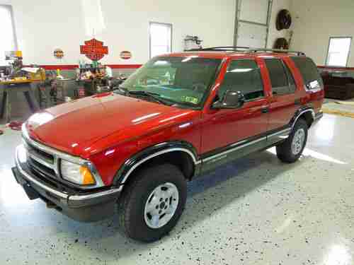 For sale is a very clean, very reliable, absolutely rust free well maintained Chevy Blazer 4WD. It is a 6 cyl. 4.3L Vortec engine, Automatic, Power everything, Am/Fm cassette and a tow hitch. This is my personal car and has been taken care of 100%. Has a fresh Pa. State Inspection-Just replaced Front and Rear Brakes and Rear Brake Drums. Current oil change just completed. Has 4 Brand new tires installed-0 miles. I have many pictures of the car inside and out, if interested please let me know and I can e-mail them to you. The paint is in immaculate condition with only one scratch on R/R quarter, the right side view mirror was repaired and there is a dent and scratch on lower rear bumper. I have picture of these items. The air conditioner doesn't hold a charge all year, but with 2 cans of freon it will last a couple months. I do this once or twice a year and it gets me through the hot summer months. I'm not 100% sure where the leak is, I never had that checked. There is one knob missing on the radio's equalizer, a couple speakers are not working and there are a couple lines on the rear defroster that don't heat up. The car has 151k miles on it and runs very strong. If you have any questions, please ask. This is a very reliable and very good looking vehicle!!