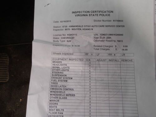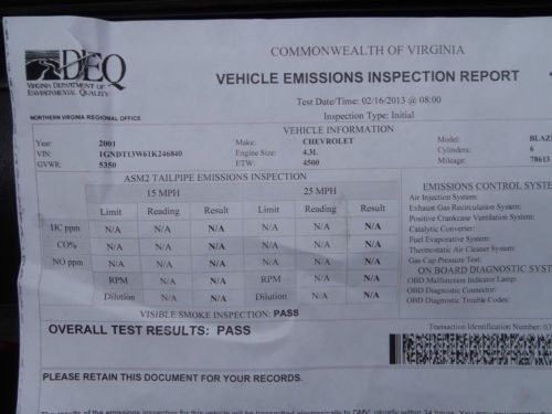 I am an Ebay car seller since 2003 2001 Chevy Blazer LS Only 78K--4X4 New tires, Inspection & Emission No rust on the body No accidents-Original-shiny paint Here is a very nice Blazer with only 78K miles. The tires are Michelin mud & snow tires. These are very recent. This Blazer passed Inspection & emission in Virgina only 200 miles ago. [see photo of report] All safety items are good. The owner bought a new SUV. Now this one is on a no reserve sale.The top bidder will get this Chevy. Facts: