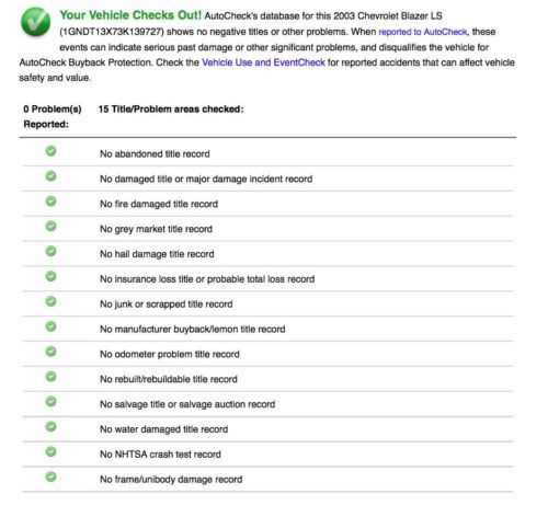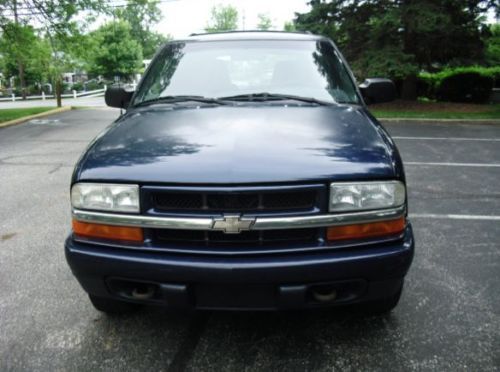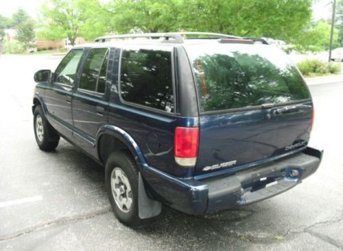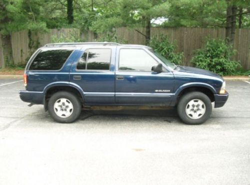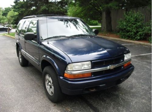 This Blue 2003 4 Door Chevy Blazer LS 4X4 is an excellent car so don't miss out on it! This is a fully loaded vehicle which comes with power steering, power brakes, power windows, power locks, power mirror, tilt, cruise control, AM/FM stereo CD player, dual airbags, roof rack, ABS, an cold A/C system. The audio system is loud and clear and the A/C blows cold! The exterior of this vehicle also looks pretty great in Blue. There are a few scratches on the car and areas on the hood where paint seems to have faded a bit. Other than that, the truck is in great shape and condition and would make a great second car for the upcoming harsh winter or a great first car or commuter. The CARFAX report is clean, see for yourself (images attached - or run your own CARFAX report). The car is without warranty and sold as is. Don’t miss out on a chance like this! Bid on this car while you can! Happy Bidding!