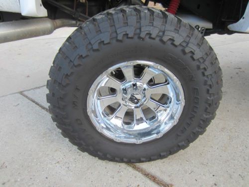 BAD ASS Sound System 2. "Fortress" security system. 3. Keyless engine start and keyless entry 4. Skyjacker suspension. 5. 20' HD wheels on 42"TORO tires 6. Beacon strobe system. In front lights and rear tail lights . All LED 7. Dual Batteries 8. High output alternator 9. Rear LED interior lighting 10. 4 wheel disk brakes 11. Warren hubs 12. Dual Dynaflo Exhaust 13. Air operated Train horns There is much more too many extras to list. |