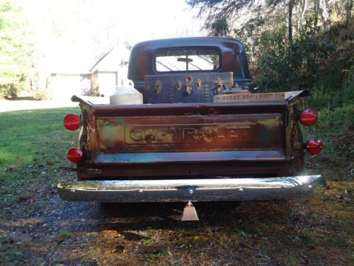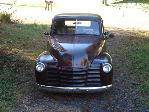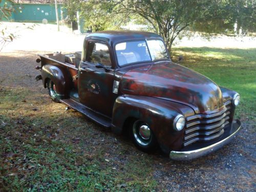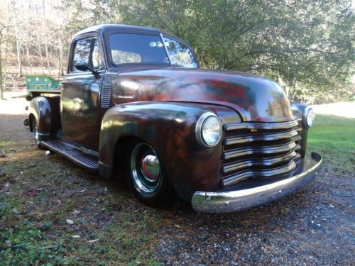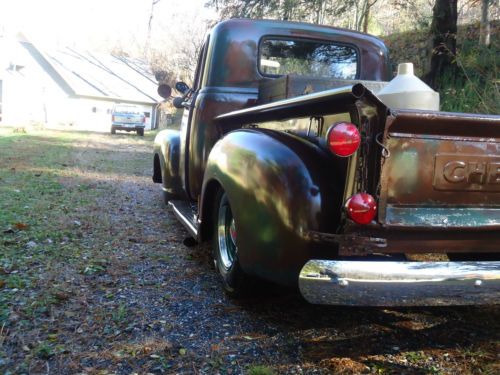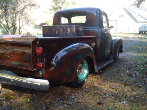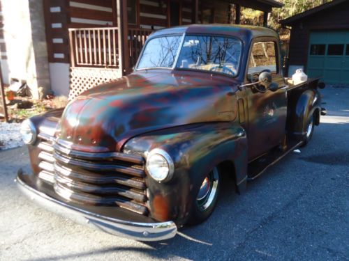 1948 Chevrolet 3100 short bed pickup with lots of new parts.truck sets on a s10 frame ,355 small block chevy angle plug dart heads,aluminum intake new600 holley carb. 69 z28 air cleaner.new headers,new exhaust flowmaster mufflers.350transmission with 3500 stall.10 bolt rear end. truck has new bumpers ,hood,lokar shifter,seat cover,carpet.dolpin gauges,all new glass,door components,all new rubbers,new wood in bed and new gas tank in bed, all new wheels and tires ,new wiring from front to back ,s10 steering column,new steering wheel.the body was left with rust on cab corners and cowl rust at the bottom.we sprayed one coat of clear to protect truck from further rust.truck looks great gets a lot of attention.runs down the road great.so come on and bid on a great little truck with patina.i know I left some new parts out so if you have question please call at 828-226-3829.