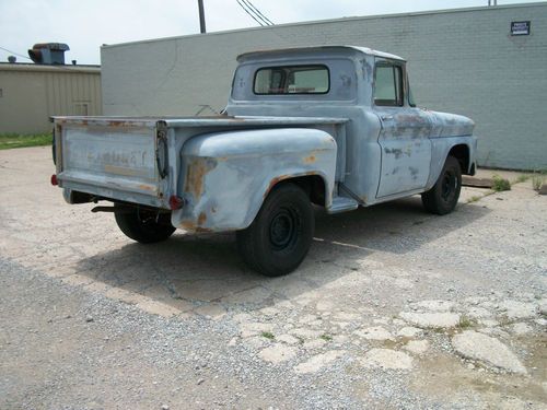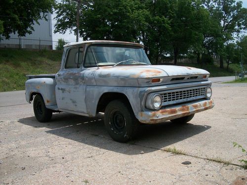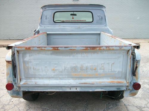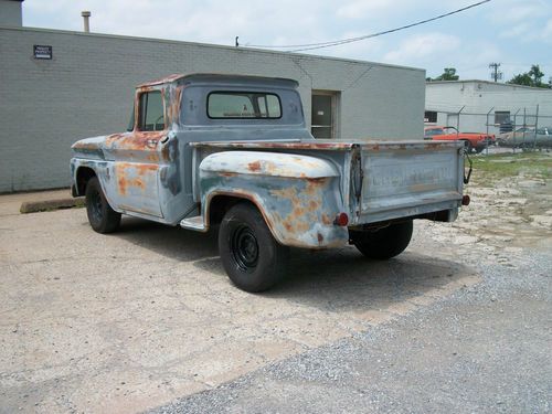 Up for auction is a 1963 Chevrolet C10 short step side pickup 6cyl 3spd. I purchased this truck from a 75 year old gentleman that bought it 25 years ago from his wifes uncle, who I'm told, purchaced it new. I was also told the mileage is correct at 51,097 and haven't seen any reason to question that. Look closely at the pictures and you will see this is a very solid and original truck. Note the picture of the rearend and the spiral shocks, which I believe to be original, the wear on the original rubber floor mat, and the lack of dents on the inside bedsides and front bed panel and the tailgate. The previous owner started some work on truck many years ago and then lost interest or was unable to finish. He sanded the truck down and primed then replaced the wood floor in the bed, but set outside and weathered. Body is still solid with minimal rust and bed floor is also still solid. The original color was a dark green, the drivers door has been replaced at some time. There is a small rust area at the back bottom of that door but didn't see any on pass door. The cab corners have a little rust and pass front fender has some. I took pictures of any problem areas so you can see what this truck will need to be nice. The interior is useable as is. I do have the factory radio and it is included. The tag and registration hadn't been brought up to date since 1993 so that has been taken care of and comes with an Oklahoma title with a current registration and tag. The tires are showing some cracks, still hold air, but wouldn't expect to drive it very far on them. The truck runs and drives great, not a lot of squeaks and rattles. I can store this truck up to 30 days free for the winning bidder and can help load. Shipping is buyers responsibility and cost. If you have any questions or need more pictures email or call. Bills Muscle Car Parts 918-664-1967