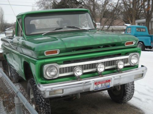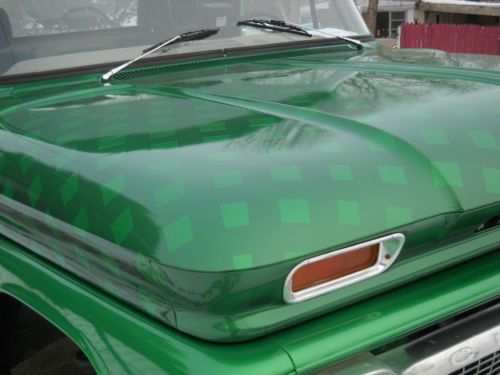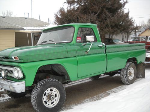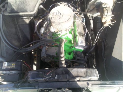 truck is a 1964 body on 1976 running gear. has a 350 with headers and automatic transmition. brand new 315/75/16 (same as 35s) Fierce attitude tires, new paint. body is straight with little to no rust. has a tilt steering colum out of a 80s chevy pickup. the bed wood needs redone and the interior is not original (will get picts of the interior up in the next few days) its bucket seats with the foulding consol in the middle for the extra jump seat. I have also installed speakers in the doors for the radio. and dash is now black with green glove box. it needs a sending unit for the fuel tank, and it leaks a little transmission fluid. there is also a rattle in the dash that i have not chased down. this is not a show truck. Just a good old truck. buyery responsible for shipping or pickup. will except paypal. truck is for sell locally and will end action early if it sells.